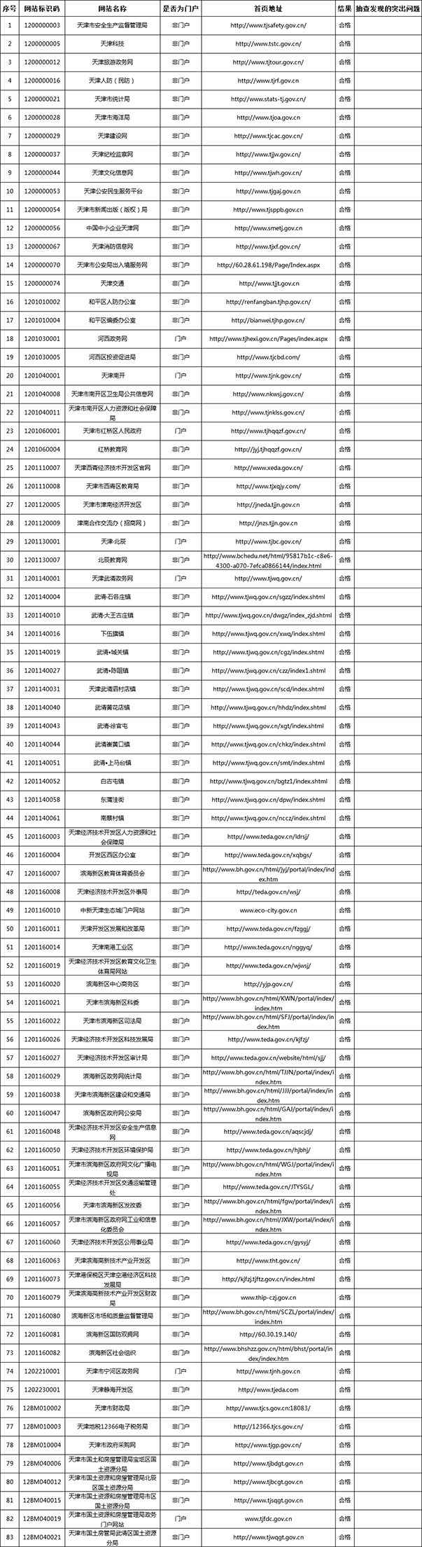 按照国务院办公厅工作安排,天津市于10月1日至12月18日对在线运行的217个政府网站进行了检查。此次重点抽查了83个政府网站,抽查比例38%,合格率100%。总的来看,全市政府网站能够按期更新,网站打不开的问题得到全面解决,抽查发现的问题主要是网站运行中的断链、无效链接较多,部分单位网站还存在应更新未更新问题等。现将抽查单位情况公布如下: