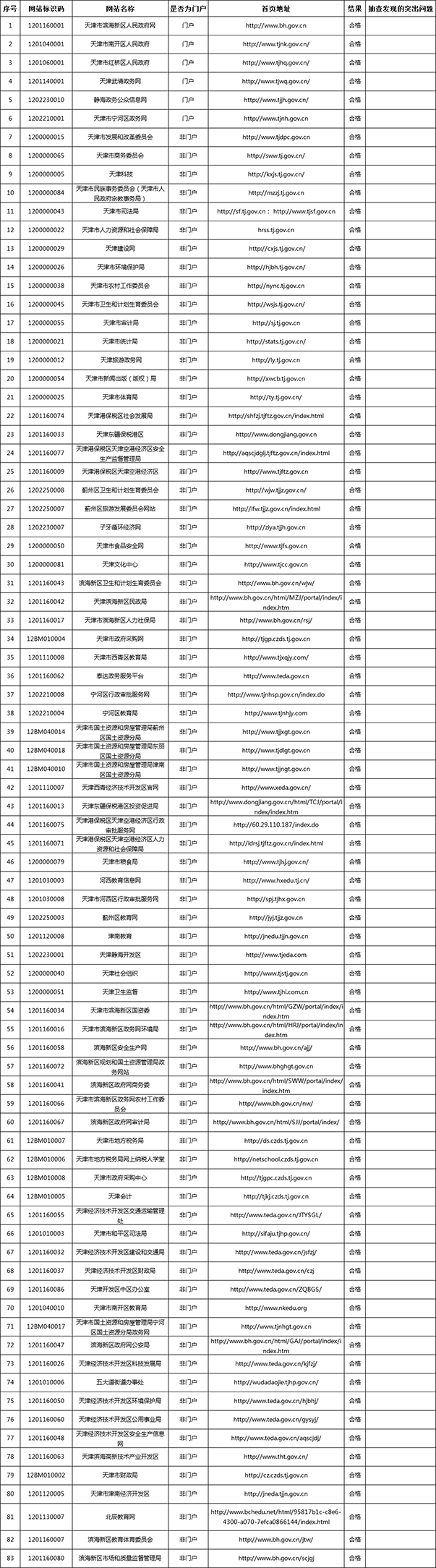 按照国务院办公厅关于政府网站常态化监管工作要求,今年二季度,天津市共对83个政府网站进行了抽查,占全市政府网站的比例为49.7%,抽查合格率为100%。通过抽查发现,全市政府网站信息内容基本实现按期更新,首页内容较丰富,一些单位专题建设水平有了较大提升,存在的问题主要是网站运行中的错误链接、无效链接较多,部分单位网站因技术原因造成短期无法访问,互动类栏目内容数量不足、质量不高等。市政府办公厅已督促有关单位及时整改相关问题,并将有关单位网站出现的问题列入下一轮抽查的重点事项,确保有关问题不复发。现将抽查情况公布如下:
