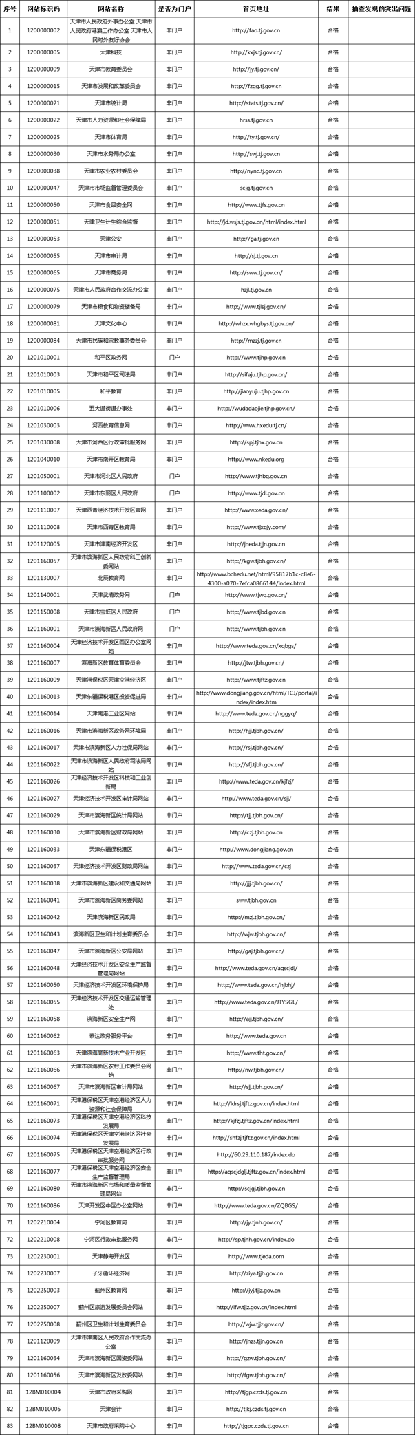 四季度,天津市政府网站抽查的重点是各单位网站信息发布的及时性、准确性,链接及功能的可用性。截止12月18日,天津市在线运行网站共134个,其中重点抽查83个,抽查比例61.9%,合格率100%。总的来看,天津市政府网站信息内容建设态势良好,市、区两级门户网站与部门网站对照指引规范,优化页面布局、增加信息内容、完善网站功能,同时涉及机构改革的市级部门提前筹划,机构调整与网站建设同步实施、同步上线。存在的问题主要是部分政府网站的历史数据延续性差,内容页内图片不能正常显示,无效链接较多,还有部分单位网站互动类栏目内容数量不足、质量不高,有的单位网站还存在用语不规范、有错别字问题等。对抽查发现的问题,天津市要求有关单位进一步提升网站功能可用性,及时整改相关问题,并将有关单位网站出现的问题列入下一轮抽查的重点事项进行重点检查。