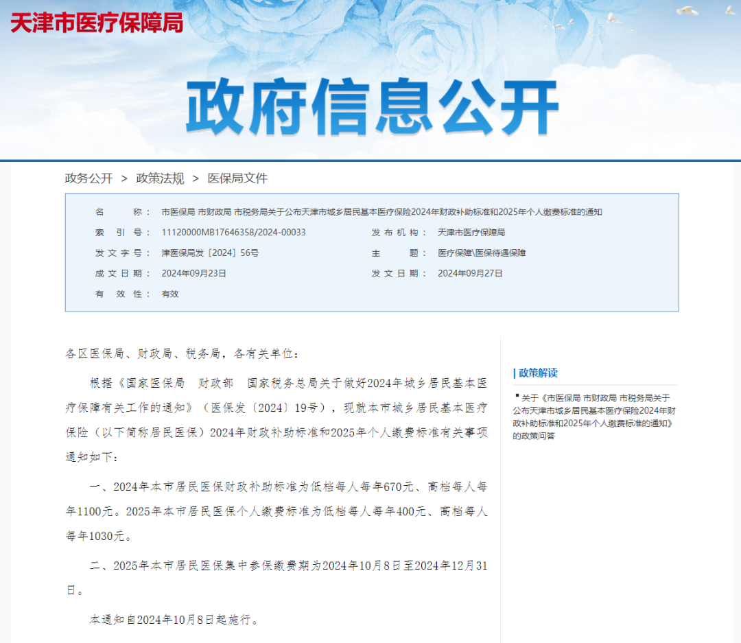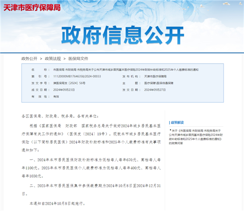 日前,天津市医保局网站公布了天津市城乡居民基本医疗保险2024年财政补助标准和2025年个人缴费标准,全文如下: