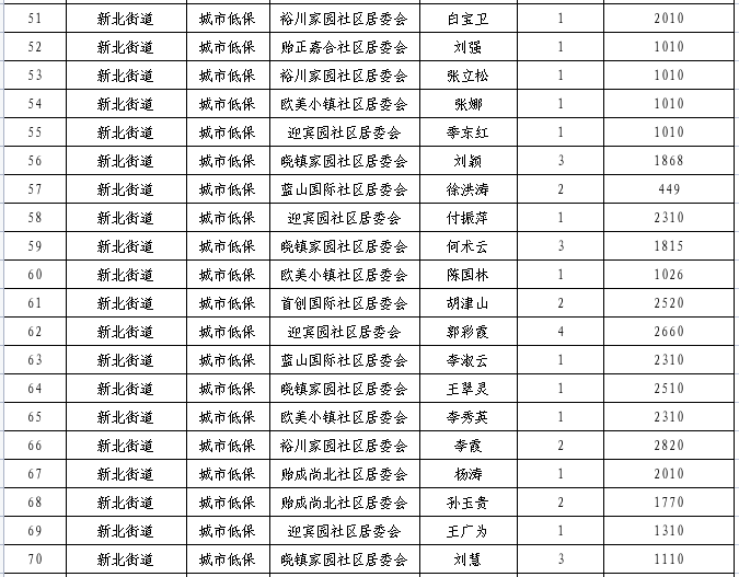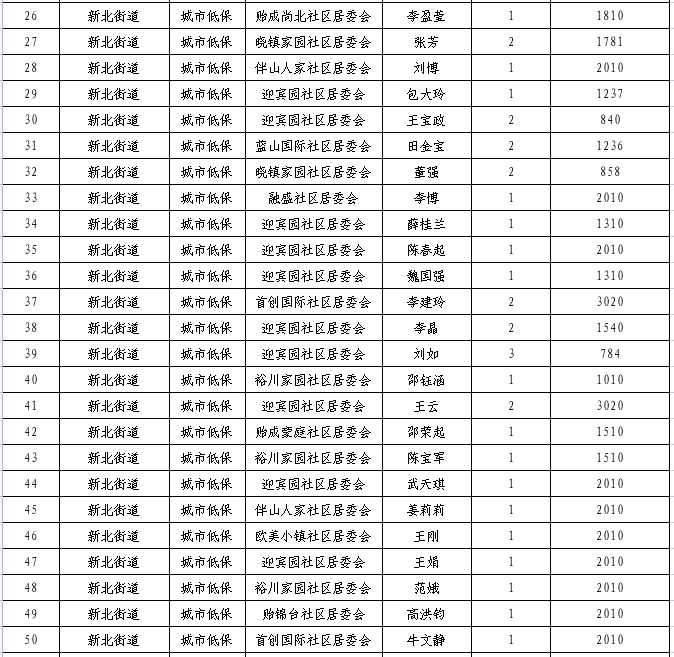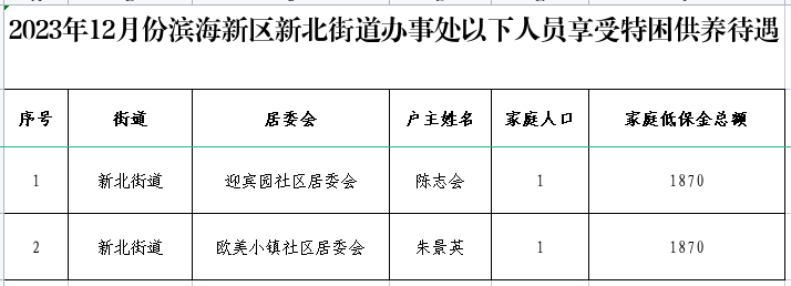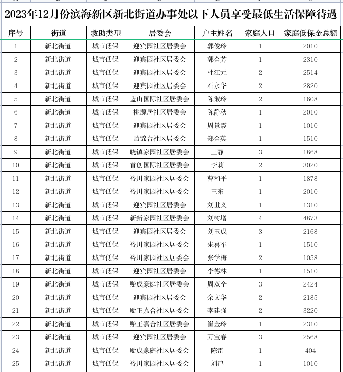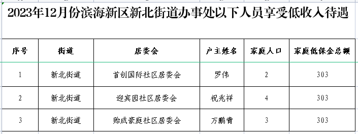 2023年12月份新北街道特困供养待遇人员、低收入待遇人员、最低生活保障待遇人员
