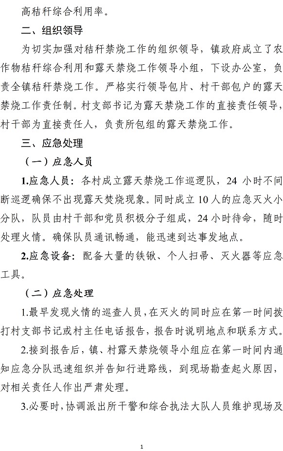 杨家泊镇《关于农作物秸秆综合利用和露天禁烧的决定》应急预案